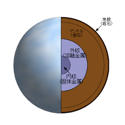 地球は大きく分けると4層構造をしています(右の図)。我々が立っている地面の直下は
