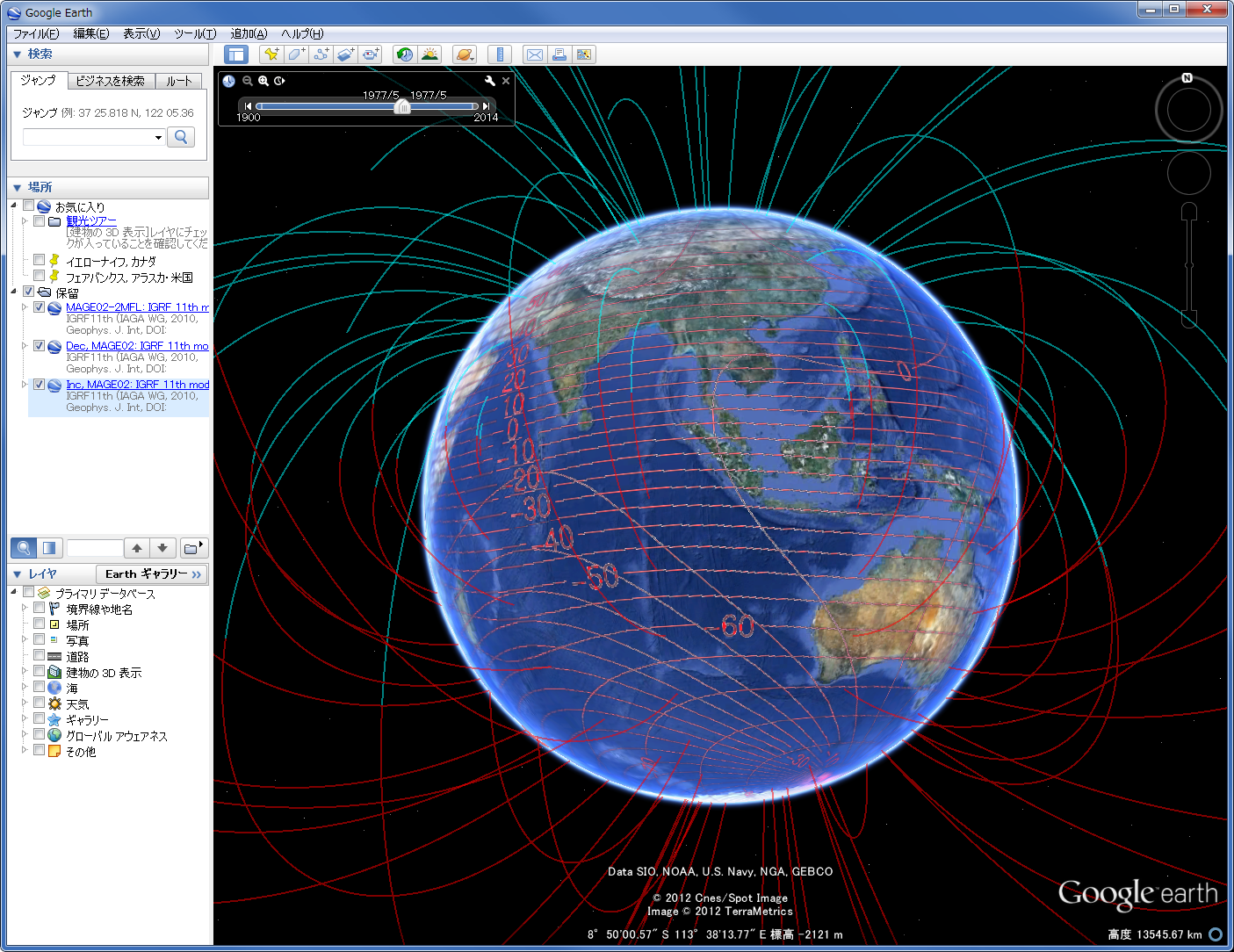 そこで、1900~2020年のIGRFによる磁力線と、地表での観測される磁場成分の変化の様子をGoogle Earth KMLファイルにしました。